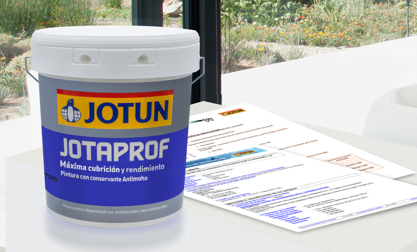 Jotaprof, máxima calidad profesional ahora en una pintura sostenible. Descarga aquí el certificado DAP de nuestra pintura para interiores.