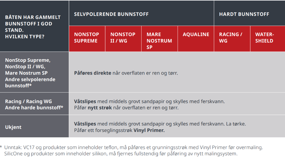 * Unntatt Seajet 034, Hempel Glide Cruise og Hempel Glide Speed, International VC17 eller annet bunnstoff som innholder teflon. Et grunningsstrøk med Vinyl Primer må påføres før overmaling.